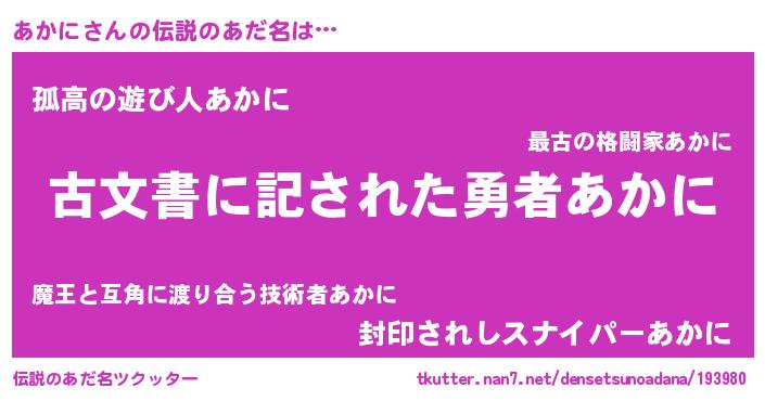 | 男性向けラノベタイトル風あだ名 | 『あかに~年齢イコール彼女いない歴の魔法使い~』 |