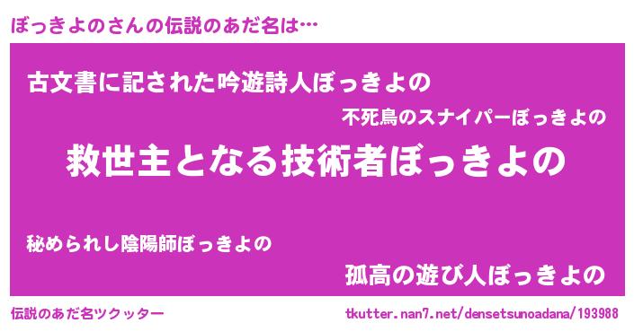 | 意味不明あだ名 | 『住所不定無職ぼっきよの(9歳)』 |