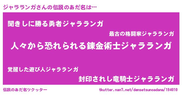 | 男性向けラノベタイトル風あだ名 | 『魔弾の王とジャラランガ』 |
