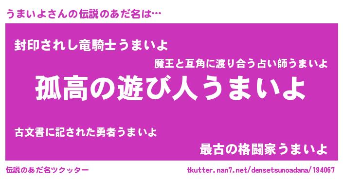 | 意味不明あだ名 | 『自称うまいよ』『つくし科うまいよ属』 |