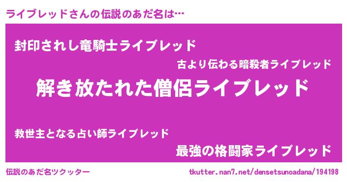 | 男性向けラノベタイトル風あだ名 | 『この素晴らしい世界にライブレッドを!』 |