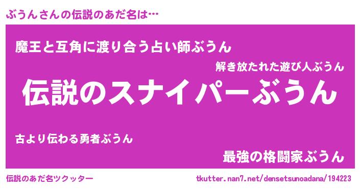 | ヒーロー風カッコイイあだ名 | 『スーパーブウン』『友情の使者ぶうん』 |