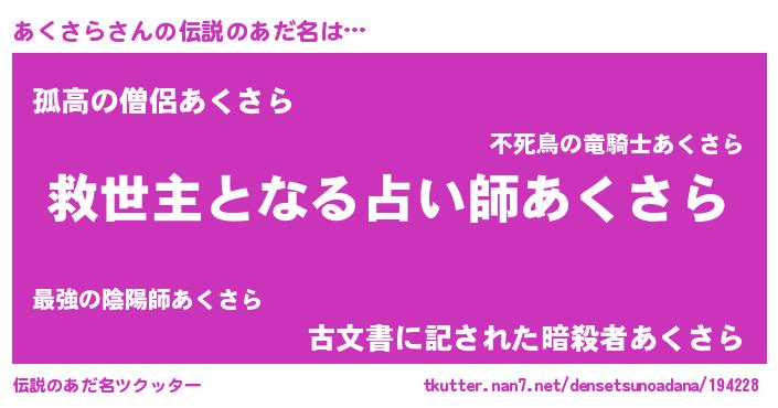 | ヒーロー風カッコイイあだ名 | 『究極戦士アクサラ』『炎刃騎士アク』 |