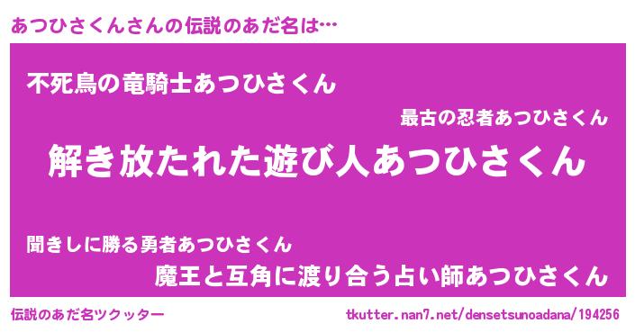 | ヒーロー風カッコイイあだ名 | 『魔戒騎士アツ』『仮面アツダー』 |