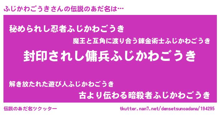 | 男性向けラノベタイトル風あだ名 | 『ふじかわごうきに滅ぼされるだけの簡単なお仕事です』 |