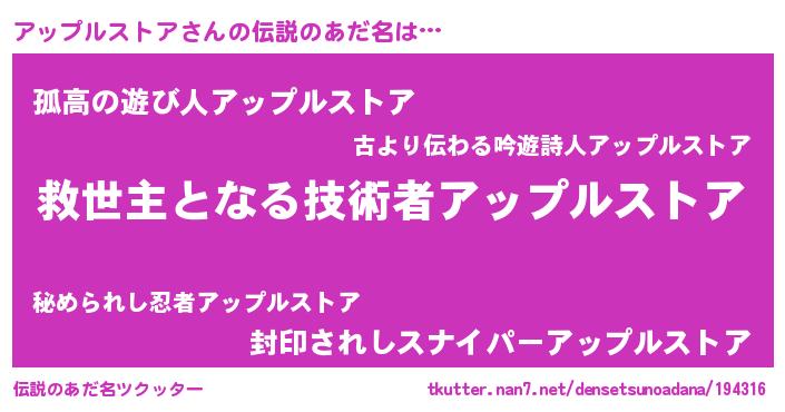 | 女子向けラノベタイトル風あだ名 | 『死神アップルストアの再婚』 |