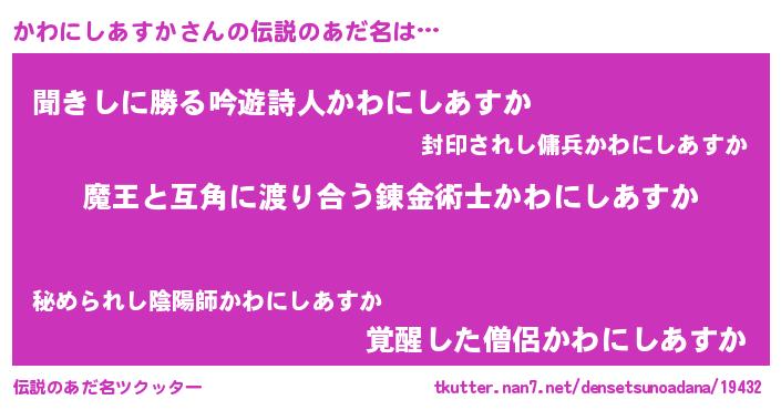 | 女子向けラノベタイトル風あだ名 | 『かわにしあすか恋絵巻』 |