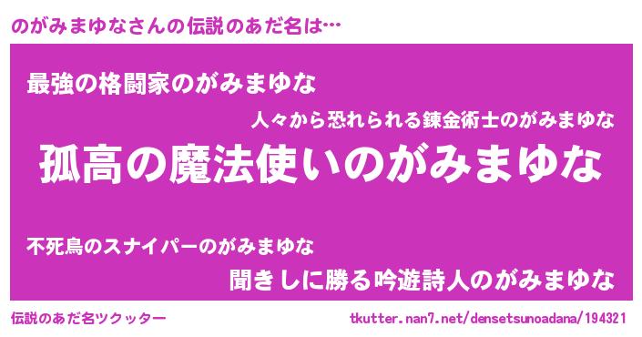 | 意味不明あだ名 | 『自称のがみまゆな』 |