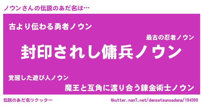 | 胡散臭い通販商品みたいなあだ名 | 『あなたにだけ特別に提供する限定10本のレアな日本酒…その名も「ノウン」』 |
