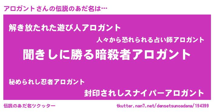 | 男性向けラノベタイトル風あだ名 | 『アロガントという概念が存在しない退屈な世界 』 |