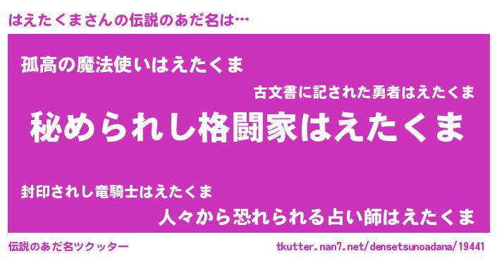 | 意味不明あだ名 | 『自称はえたくま』 |