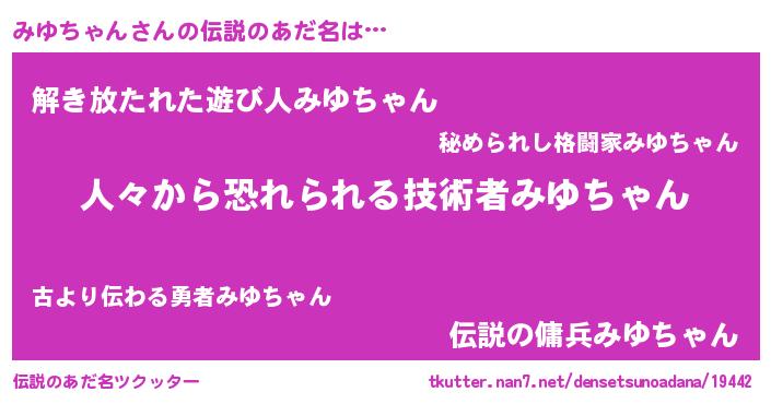 | ヘコむあだ名 | 『みゆお』『みゆもー』『なまこ酢』 |