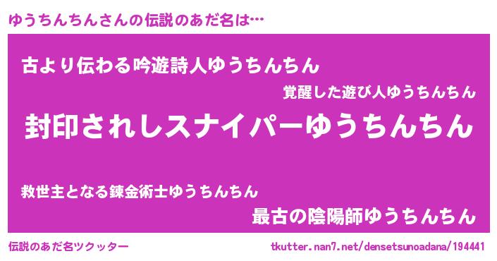 | ヒーロー風カッコイイあだ名 | 『スーパーユウチンチン』『銀牙騎士ユウ』 |