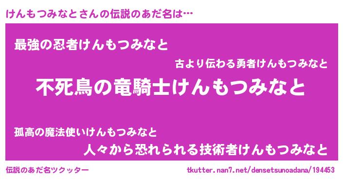 | 女子向けラノベタイトル風あだ名 | 『けんもつみなと姫と円卓の騎士』 |