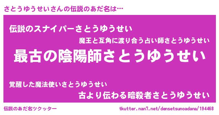 | ヒーロー風カッコイイあだ名 | 『仮面サトダー』『ネオサトウユウセイ』 |