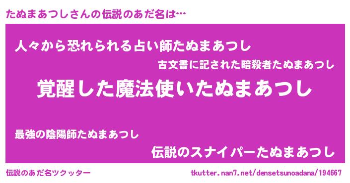 | ヒーロー風カッコイイあだ名 | 『幻影騎士タヌ』『スーパータヌマアツシ』 |