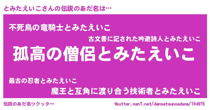 | 男性向けラノベタイトル風あだ名 | 『魔弾の王ととみたえいこ』 |