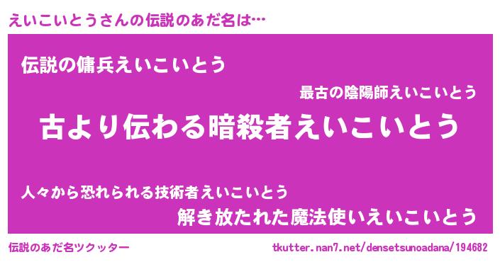 | 男性向けラノベタイトル風あだ名 | 『えいこいとうに滅ぼされるだけの簡単なお仕事です』 |