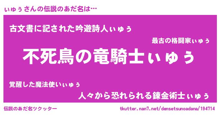 | 男性向けラノベタイトル風あだ名 | 『転生したらぃゅぅだった件』 |