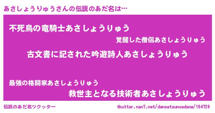 | ヒーロー風カッコイイあだ名 | 『ネオアサショウリュウ』『仮面アサダー』 |