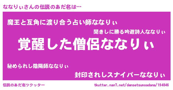 | 男性向けラノベタイトル風あだ名 | 『ななりぃに滅ぼされるだけの簡単なお仕事です』 |
