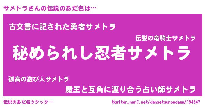 | ヒーロー風カッコイイあだ名 | 『ウルトラサメトラマン』『ネオサメトラ』 |