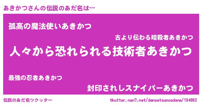 | 男性向けラノベタイトル風あだ名 | 『アキカツスレイヤー』 |