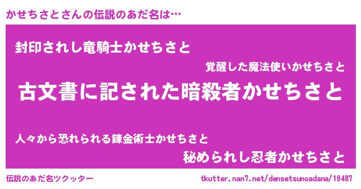 | 男性向けラノベタイトル風あだ名 | 『かせちさとに滅ぼされるだけの簡単なお仕事です』 |