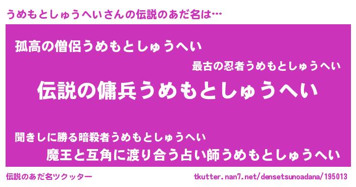| ポケモン風あだ名 | 『ウメチュウ』『ヒウメモトシュウヘイ』 |