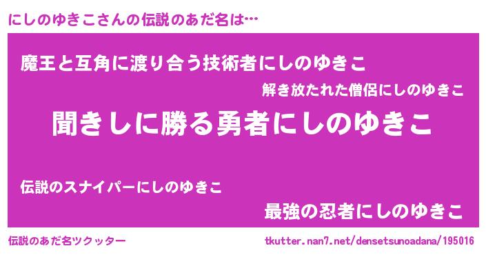 | 男性向けラノベタイトル風あだ名 | 『にしのゆきこという概念が存在しない退屈な世界 』 |