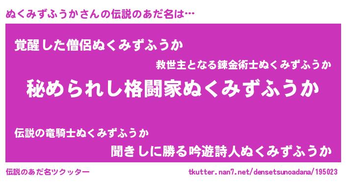 | ヒーロー風カッコイイあだ名 | 『ウルトラぬくみずふうかマン』 |