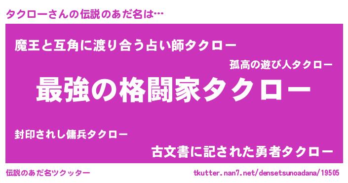 | ヒーロー風カッコイイあだ名 | 『ウルトラタクローマン』『ネオタクロー』 |
