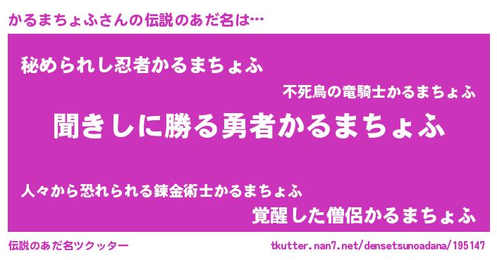 | 男性向けラノベタイトル風あだ名 | 『かるまちょふという概念が存在しない退屈な世界 』 |