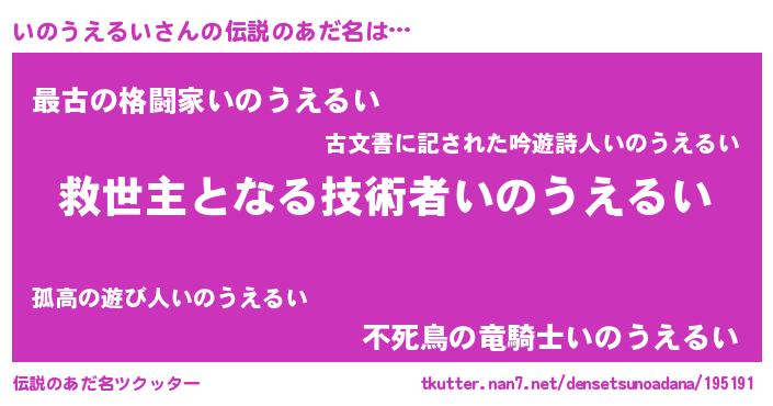| 胡散臭い通販商品みたいなあだ名 | 『芸能人もオススメする高麗人参…その名も「いのうえるい」』 |