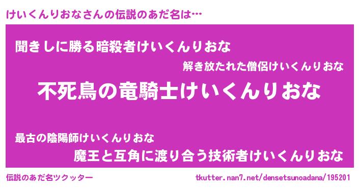 | 女子向けラノベタイトル風あだ名 | 『けいくんりおな姫と円卓の騎士』 |