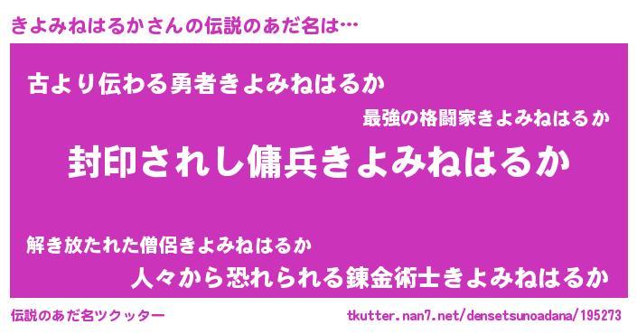 | 男性向けラノベタイトル風あだ名 | 『きよみねはるか~年齢イコール彼女いない歴の魔法使い~』 |