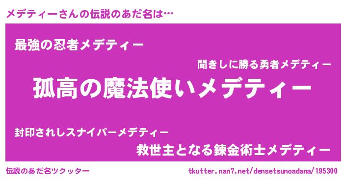 | 女子向けラノベタイトル風あだ名 | 『メデティーなんてお断りですっ。』 |
