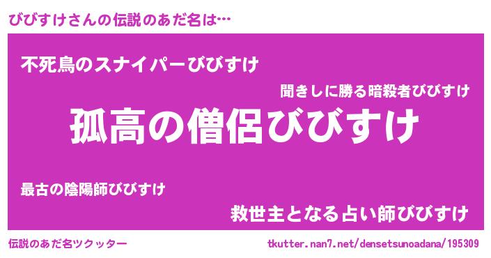 | 男性向けラノベタイトル風あだ名 | 『ダンジョンにびびすけを求めるのは間違っているだろうか』 |