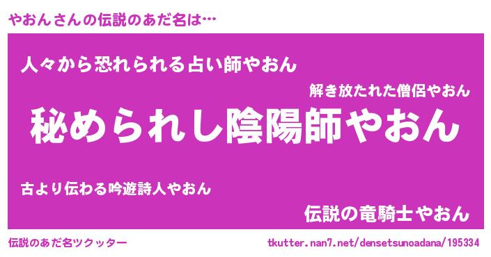 | 女子向けラノベタイトル風あだ名 | 『やおんの雑貨屋さん』『闇のやおん』 |