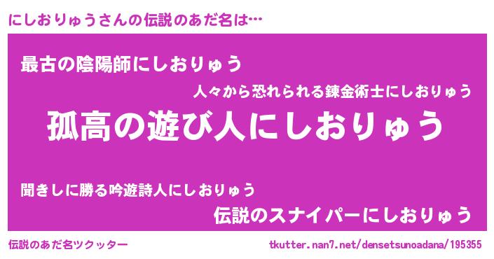 | ヒーロー風カッコイイあだ名 | 『暗黒騎士ニシ』『スーパーニシオリュウ』 |