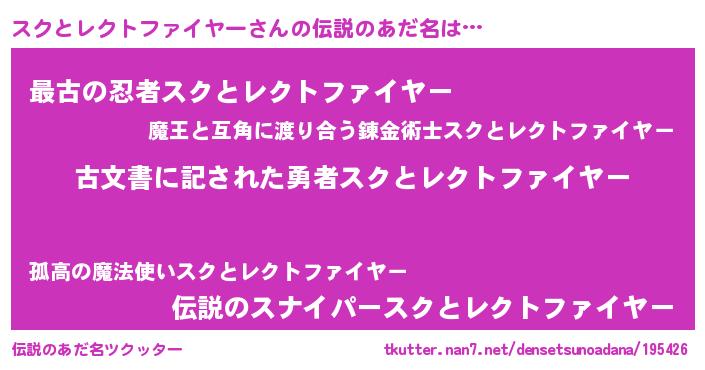| 男性向けラノベタイトル風あだ名 | 『誰もが恐れるあのスクとレクトファイヤーが、ぼくの専属メイドになるようです。』 |