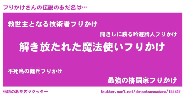 | 男性向けラノベタイトル風あだ名 | 『フりかけの嫁は女の子じゃないと思った?』 |