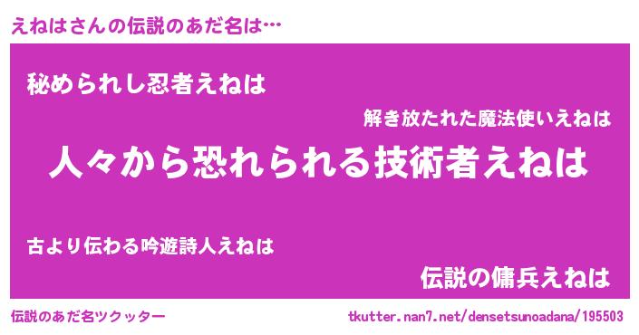| 男性向けラノベタイトル風あだ名 | 『エネハスレイヤー』『魔弾の王とえねは』 |