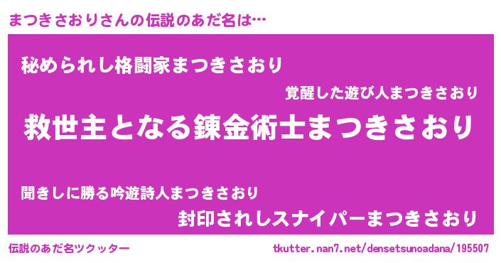 | 男性向けラノベタイトル風あだ名 | 『まつきさおり~年齢イコール彼女いない歴の魔法使い~』 |