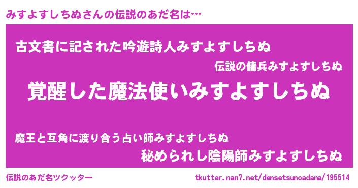 | 男性向けラノベタイトル風あだ名 | 『みすよすしちぬ~年齢イコール彼女いない歴の魔法使い~』 |