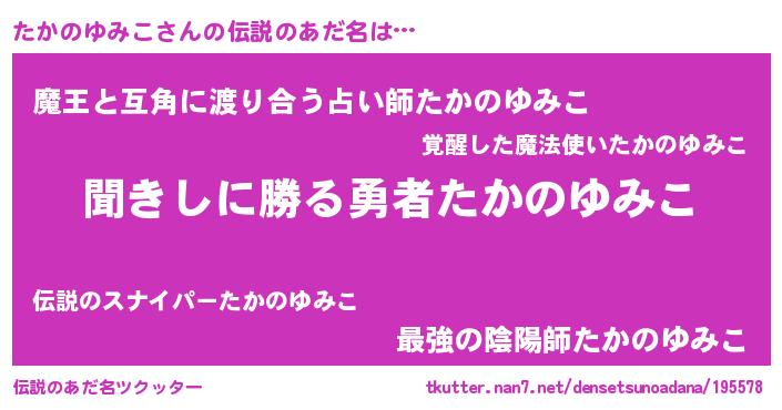 | ヒーロー風カッコイイあだ名 | 『仮面タカダー』『ネオタカノユミコ』 |