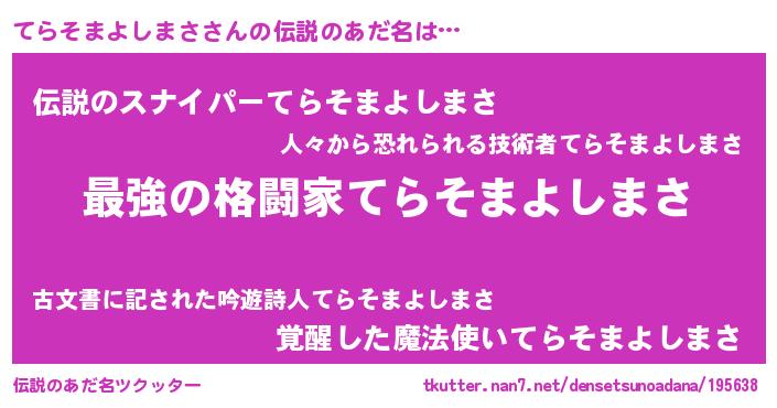 | 男性向けラノベタイトル風あだ名 | 『てらそまよしまさ~年齢イコール彼女いない歴の魔法使い~』 |