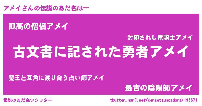 | ヒーロー風カッコイイあだ名 | 『ネオアメイ』『幻影騎士アメ』 |