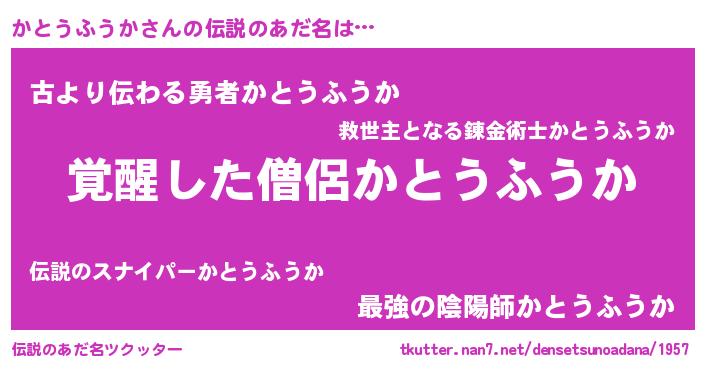 | 意味不明あだ名 | 『とにかく怪しいかとうふうか』 |