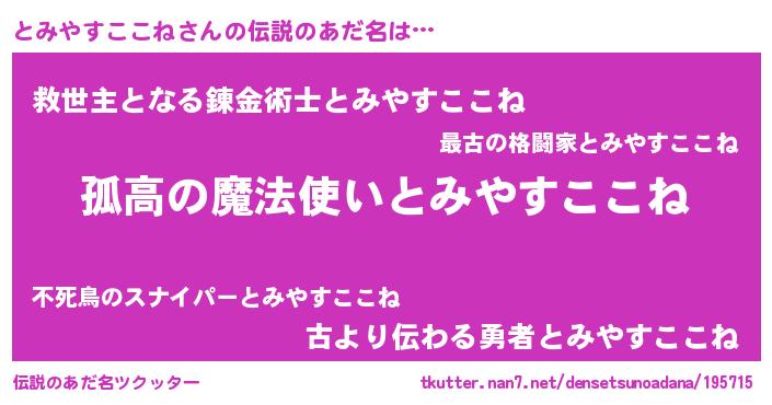 | 男性向けラノベタイトル風あだ名 | 『魔弾の王ととみやすここね』 |